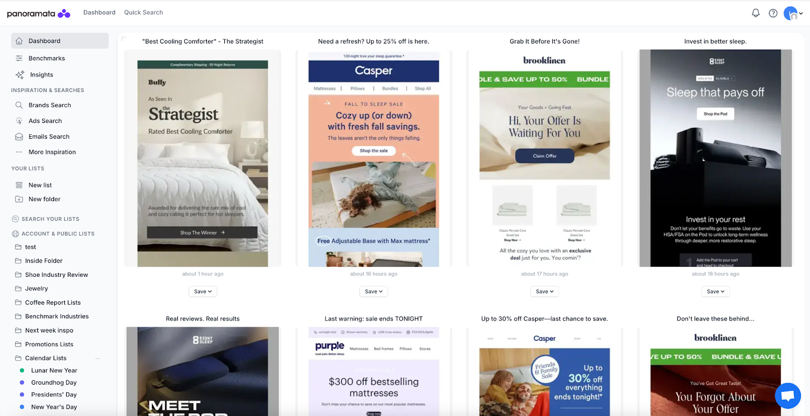 - Searchable inspiration library for emails, ads, and SMS with keyword filtering and curated collections