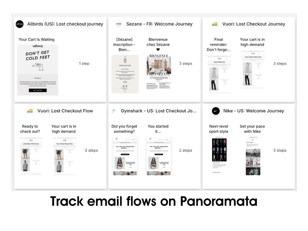 Better than Mailcharts, Panoramata monitors email and SMS campaigns across diverse business types. This includes automated email sequences (flows) like welcome series, post-transaction messages, and cart abandonment campaigns.